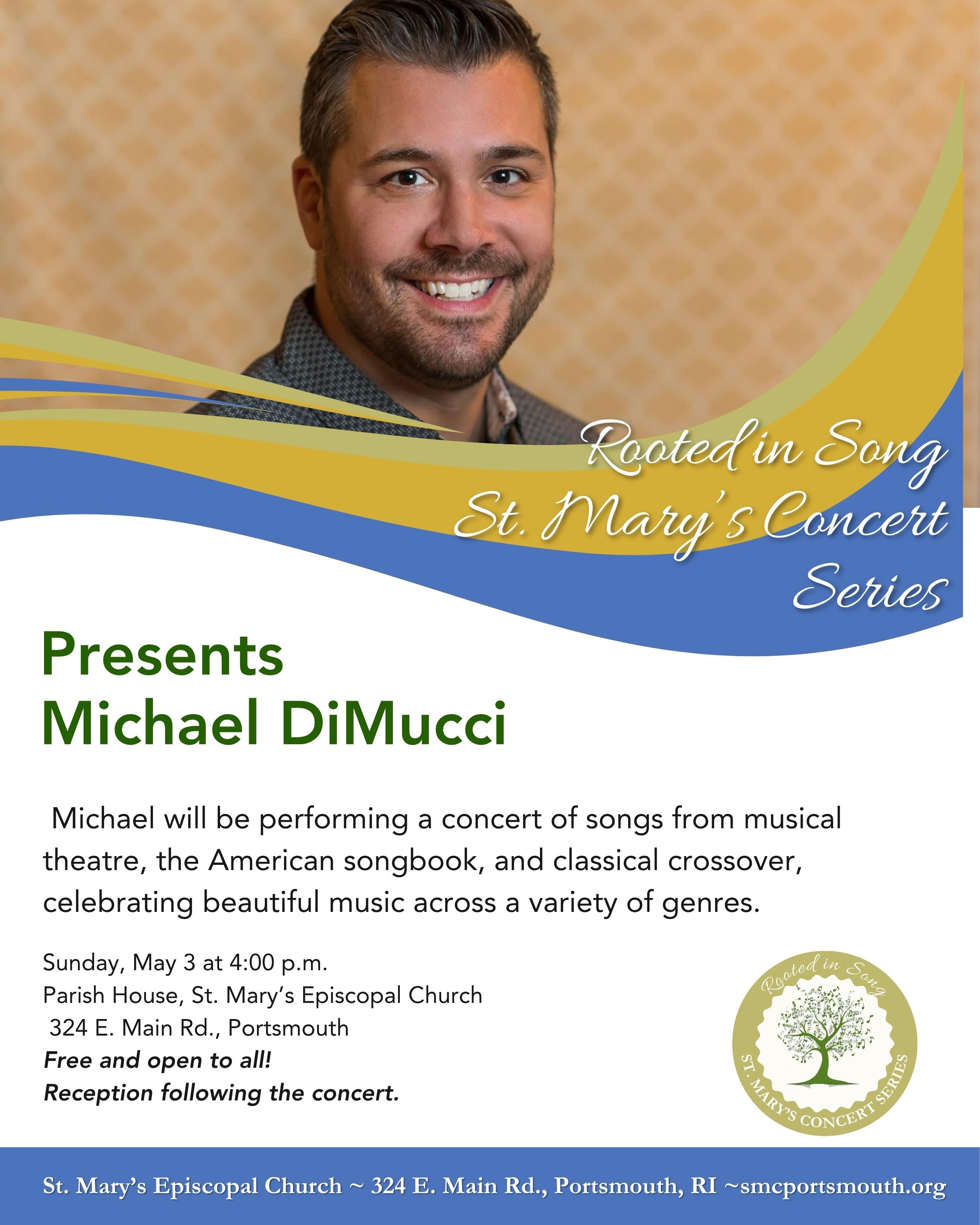 You are invited to Rooted in Song, the first concert in St. Mary's Church's new concert series, this one featuring St. Mary's own Michael DiMucci, singing popular songs from the American Songbook, musical theater and lots more!